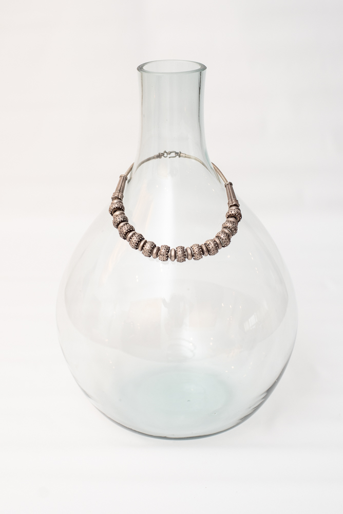 O Garrafão Colar é feito de vidro resistente e adornado por dois colares indianos.
